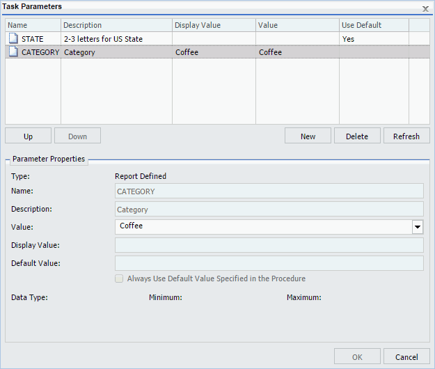 If you need to have the schedule job send a parameter and value that is not defined in the report procedure being scheduled, you can create a new parameter in the Task Parameters dialog box. Parameters referenced during processing by the Reporting Server must be assigned a value for the scheduled job to run successfully. The schedule job log report will contain information when required parameter values were not provided.