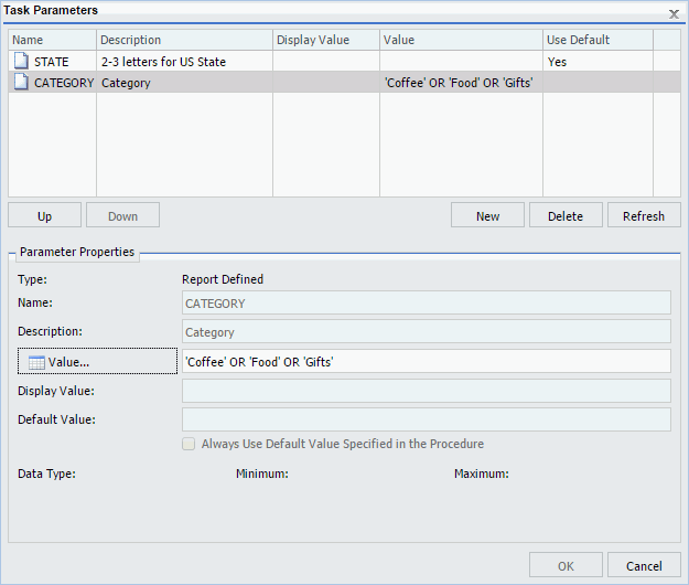 The following image shows the Task Parameters dialog box displaying the CATEGORY parameter. The CATEGORY parameter has been encoded to only use the values Coffee, Food or Gifts. The selected values will show in the Value column. Since the CATEGORY parameter has a list of possible parameter values, there is no default value specified. Therefore, the Use Default column is blank.