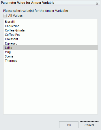 When the Value button is selected in the Parameter Properties section, a list of available values displays, as shown in the following image. Using the Ctrl key, you can select more than one value from the dynamic multiselect list.