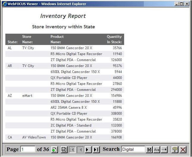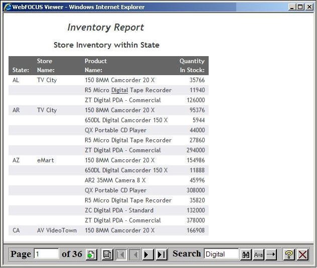 You want to use the Viewer Control Panel to navigate a long report called Inventory Sales within State to find occurrences of the string Digital, a type of electronics that you sell. After you run the report, WebFOCUS displays the first page of the report in the Viewer.