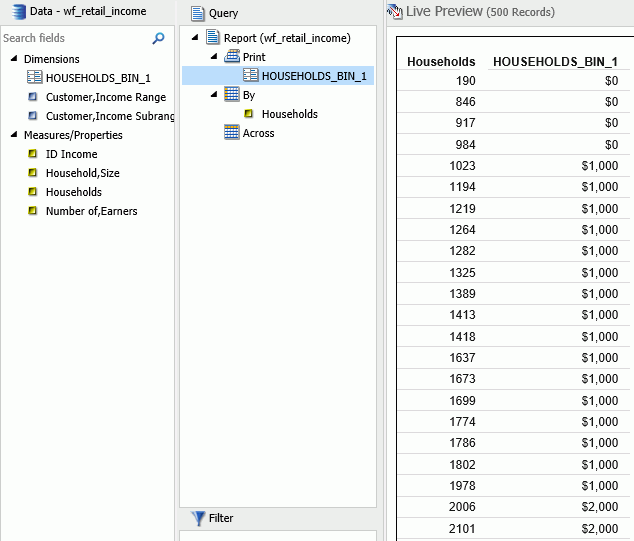 7. Optionally, you can change the Print and By field assignments to view the Households values by bin, as shown in the following image.