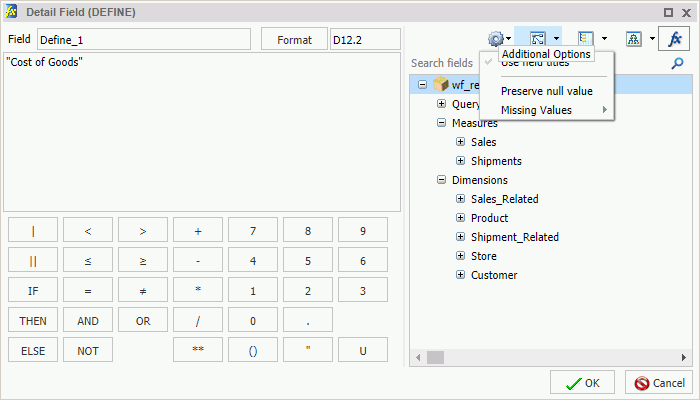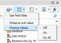 When working with DEFINEs and COMPUTEs, you can use the Missing Values option to enable or disable the display of missing values for a DEFINE or COMPUTE field. This allows you to accurately display missing values in reports, charts, and visualizations. The Missing Values option, which is accessible through the Additional Options button, is shown in the following image.