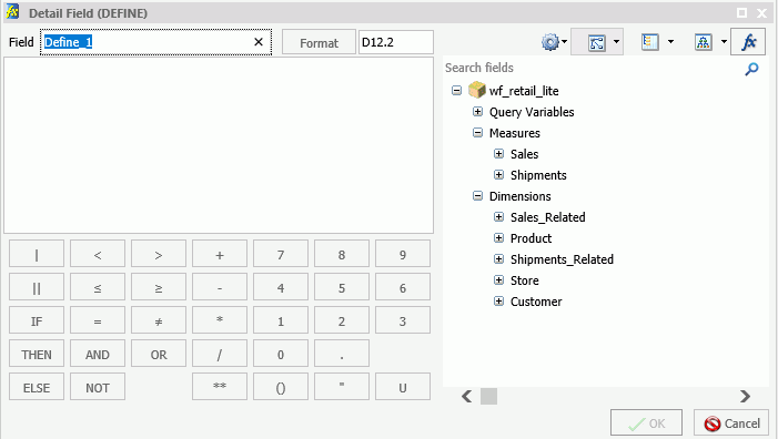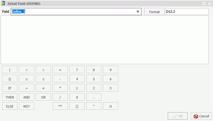 The Detail Field (DEFINE) dialog box allows you to create a defined field, type a name for the field, and enter a format.