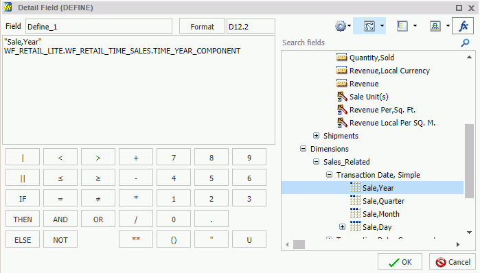 If your Define or Compute uses more than one field with the same title (for example, Sale,Year), then only the first field will be added using field titles. Any other reference to this identical field will use the fully qualified field name. For example, in a sample InfoAssist data source, Sale,Year displays as the field title for two unique fields: WF_RETAIL_LITE.WF_RETAIL_TIME_SALES.TIME_YEAR and WF_RETAIL_LITE.WF_RETAIL_TIME_SALES.TIME_DATE_YEAR_COMPONENT. In this case, only WF_RETAIL_LITE.WF_RETAIL_TIME_SALES.TIME_YEAR would display (using field titles) as Sale,Year. The other field would display using the fully qualified field name, as shown in the following image.