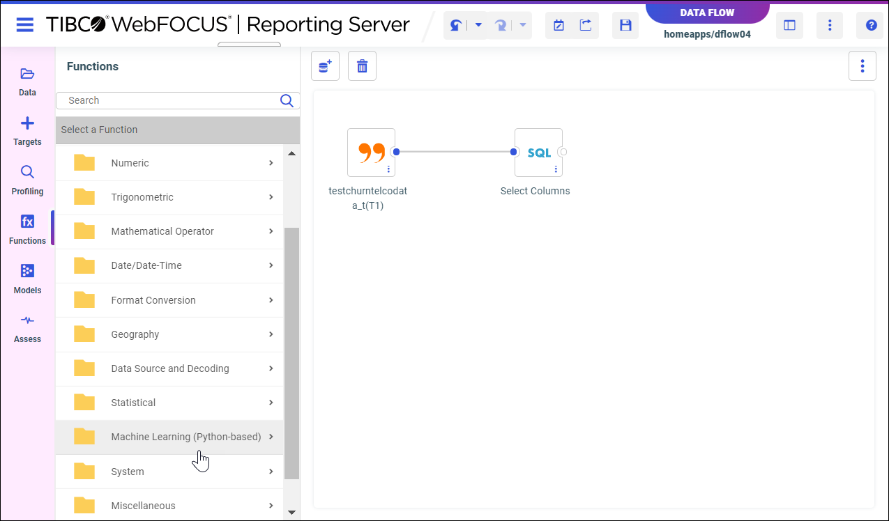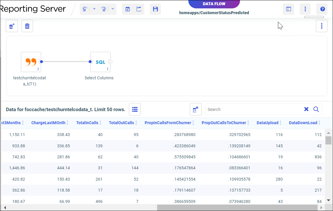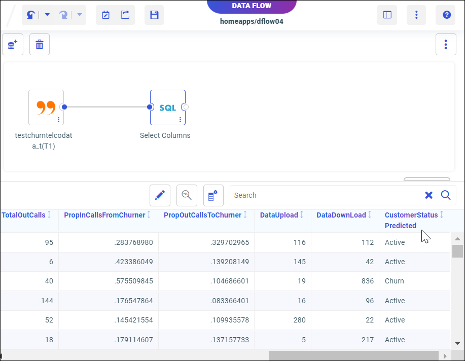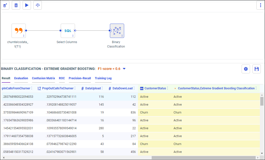 The following binary classification model was previously trained and saved. The model includes a Customer Status column that shows values of Active or Churn, as shown in the following image.