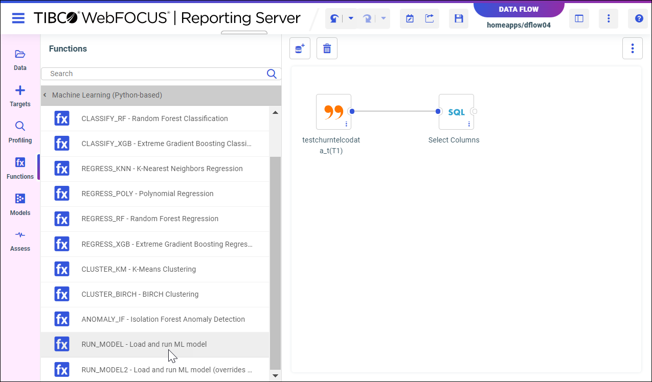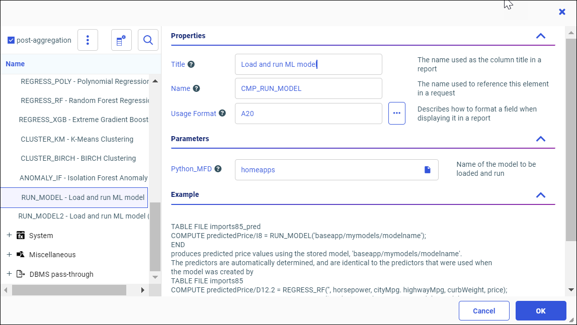 Note: There are two RUN_MODEL functions. RUN_MODEL loads and runs the ML Model. RUN_MODEL2 loads and runs the ML Model and overrides predictors.