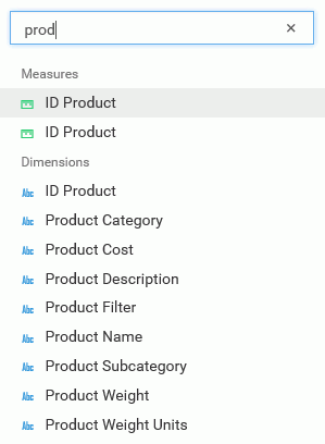 You can locate fields for your field containers using the search option. On the toolbar, click the plus sign. In the search field, start typing the field that you want to locate. You can type in whole words or partial words. The search identifies all fields that contain any instance of the characters that you specify, as shown in the following image.