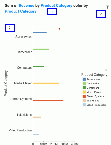 Numeric measures are displayed after the measures in the order of Y-Axis and then X-axis. If you define fields in your Grouping field container, they display after the collective measures and are preceded by the word by. If you have created a matrix marker chart, the relevant field containers for these display next. They also use the word by, as do any Detail field containers that are populated in the chart. If your chart specifies a field for color, Phone mode precedes the display of this item with color by. Lastly, if you have populated the Size field container, this displays last and is introduced by size by.