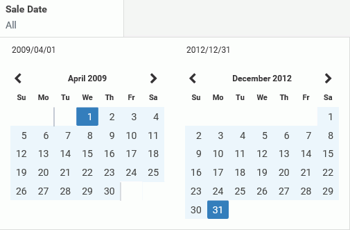 There are different types of filters in Insight. For example, if you are filtering with a date field, you can use a built in calendar to select a date range, as shown in the following image.