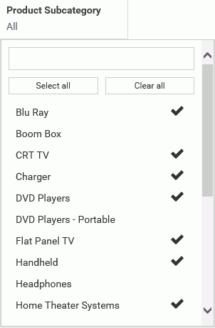You can select all values for the dimension, select one or more, or clear all selected values, as shown in the following image.