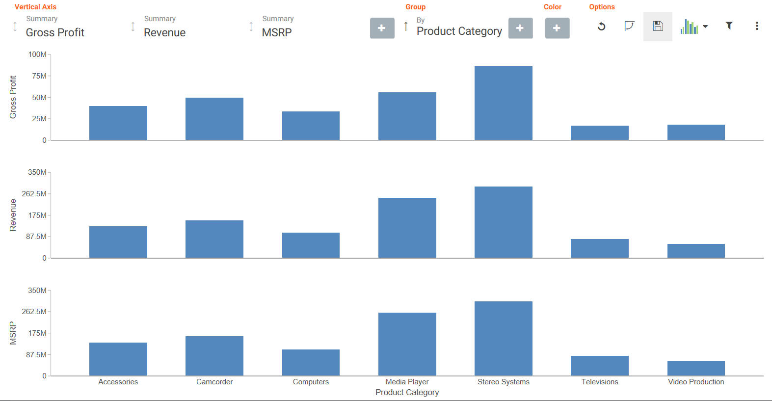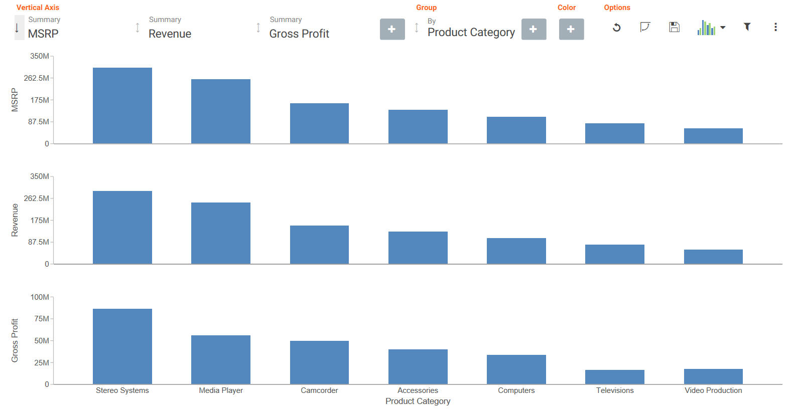 to add additional fields to your chart. For example, if you want to create a bar chart that plots Gross Profit, Revenue,
