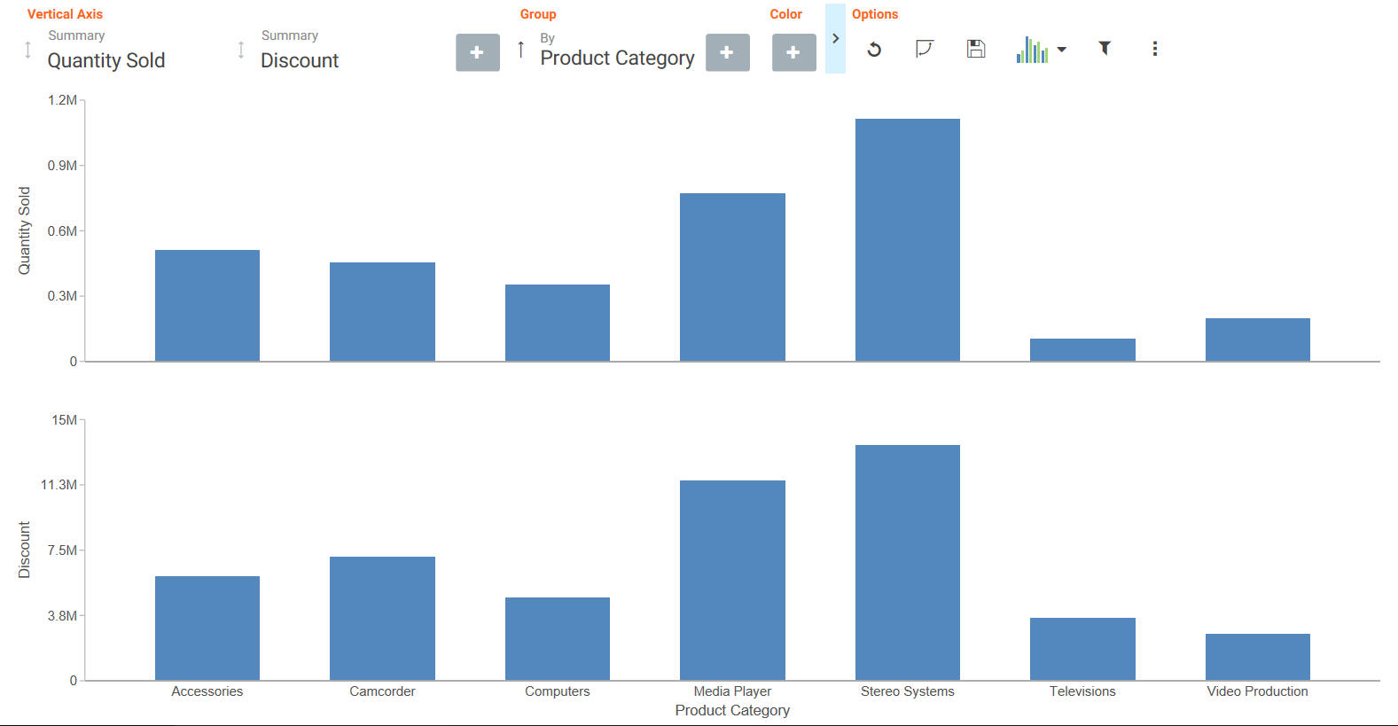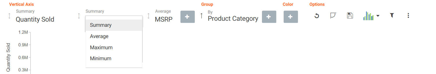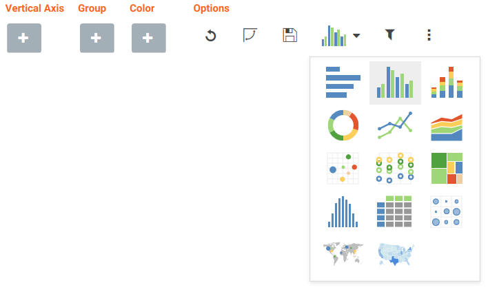 The Options toolbar is located in the upper-right corner of the Insight interface. These options control your interactions with your data, including options such as pivoting and filtering. You can also change your chart type using the Chart Picker option.