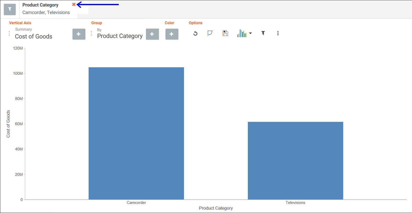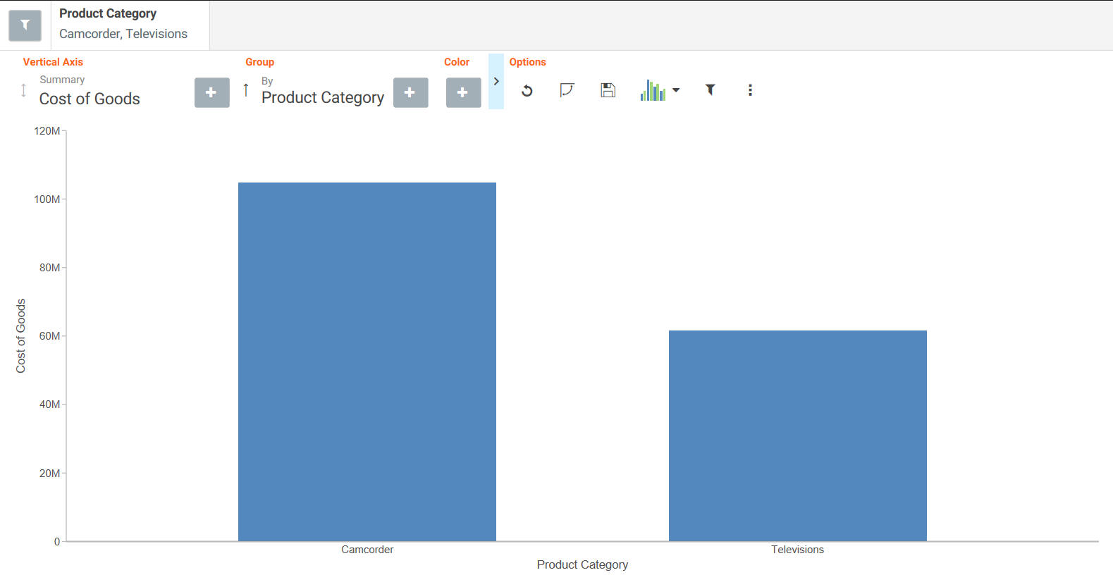 You add a filter when you want to limit the display of your data, or drill down to focus on specific data values. For example, you may want to just display data for Camcorder and Televisions, rather than all Product Categories. You can do this by adding a filter for the Camcorder and Televisions, as shown in the following image.