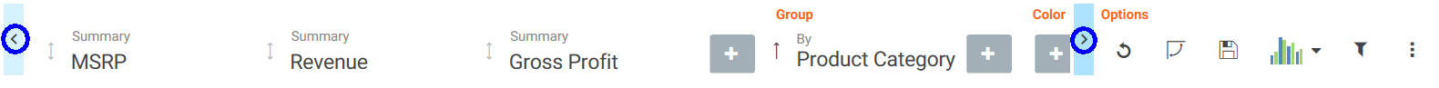 You can use the navigational arrows in the interactive header to move between the available field containers in your chart. The following image highlights these arrows, which shift the focus of these field containers to the right or left.