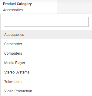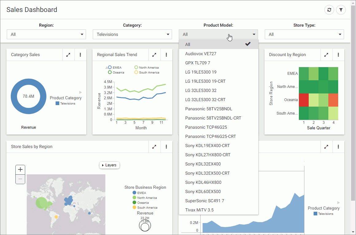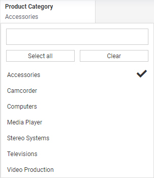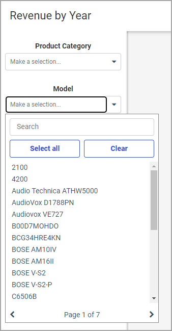 Note: Notice that, if you have parameters that come from the same field hierarchy in your data source, the filter controls are chained in such a way that each selection automatically reflects the available choices in other filters. In our example, we set Category to Televisions. Now, the Product Model filter only shows models of televisions, as shown in the following image. WebFOCUS Designer chains controls automatically, if the parameters are defined in the metadata layer with the WITHIN keyword to relate them.