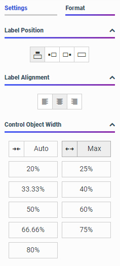 The Format tab for a filter control created for external content is displayed in the following image. You can modify the positions of labels in a control, define the alignment, and set the object width.
