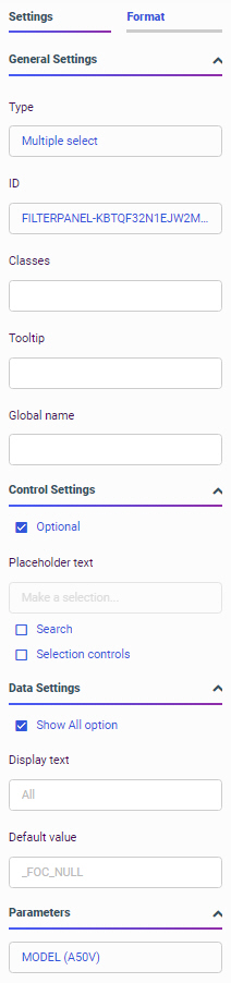 Filter controls created within a page have different configuration and styling options than filter controls added to the page from referenced, external content. When you select a filter control that you created directly within the page, the Settings tab contains the following properties: