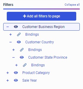The Filters tab provides options to add filters to your page and apply chaining to them. Open the Filters tab and then click Add all filters to page to create filters for all identified parameters. Alternatively, right-click a parameter in the list to create a single filter control. Each filter in the list on the Filters tab displays the filter name and, under Bindings, the data source and target items associated with the filter. Available filter values are pulled from the data source, and the selected values are passed to the target items. Chaining is indicated by tabbed hierarchies on the Filters tab, and can be applied manually by dragging one filter onto another in the list. To unchain a single filter from a hierarchy, right-click a child filter and click Unchain filter from parent. To unchain all filters in a hierarchy, right-click the parent filter and click Unchain all child filters.