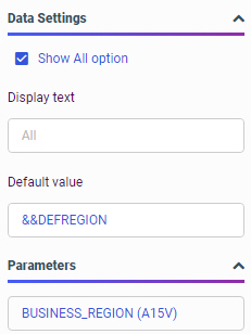Note: The Placeholder text property is only used for required controls. The placeholder text appears before a selection has been made. To change the default text for an optional control, if the Default value for the control is _FOC_NULL, meaning all values, enable the Show All option property and type a value for the Display text property. The Display text option in the control represents the _FOC_NULL, or all values, filter value.