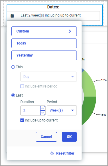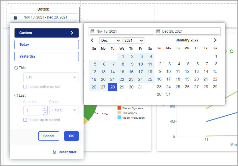 If you add a date field, you can use the date picker window to select a start or end date, range of dates, and more, as shown in the following image.