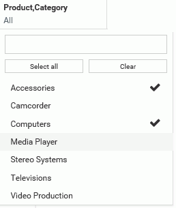 If you make selections in one filter control, and then make selections in another chained filter control that make some of the original values unavailable, those originally selected values are restored when the other filters are cleared. For example, if you set the Sale Month filter to September and December, and then set the Sale Day to 31, September is no longer visible in the Sale Month control, since it only has 30 days. Only December is selected. When you clear the Sale Day control, both September and December are selected once again in the Sale Month control.