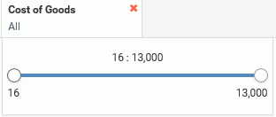 If you add a filter using a numeric field, such as a measure, (for example, Cost of Goods), you can use a slider to adjust the range of data values that display, as shown in the following image.