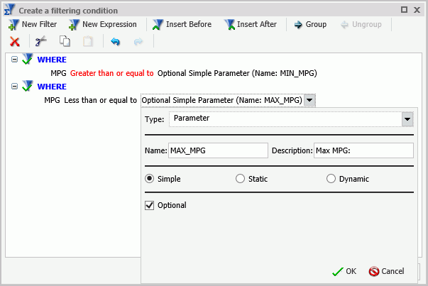 When you bring existing, parameterized content into a page, you are prompted to create filter controls for each parameter. Once created, these controls can be modified with a set of additional options that are not available when creating new content items.
