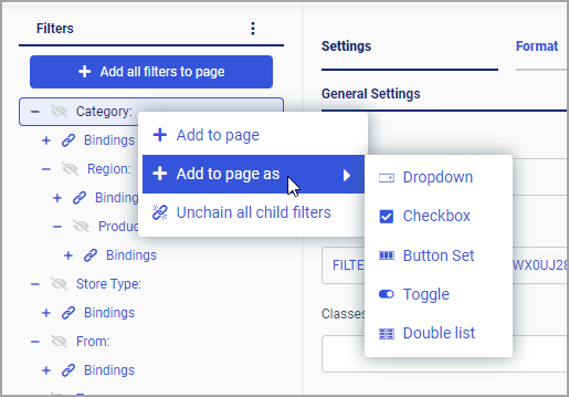 After you add filters from external content to a page, you can right-click a filter control to access formatting options. For example, you can convert a list control to radio buttons, check boxes, or a button pane, merge two related controls, and access configuration and format options on the Properties panel.