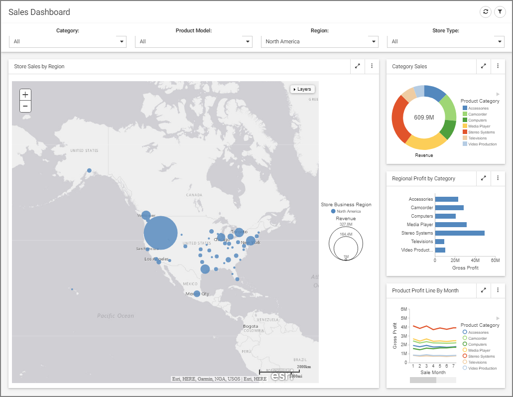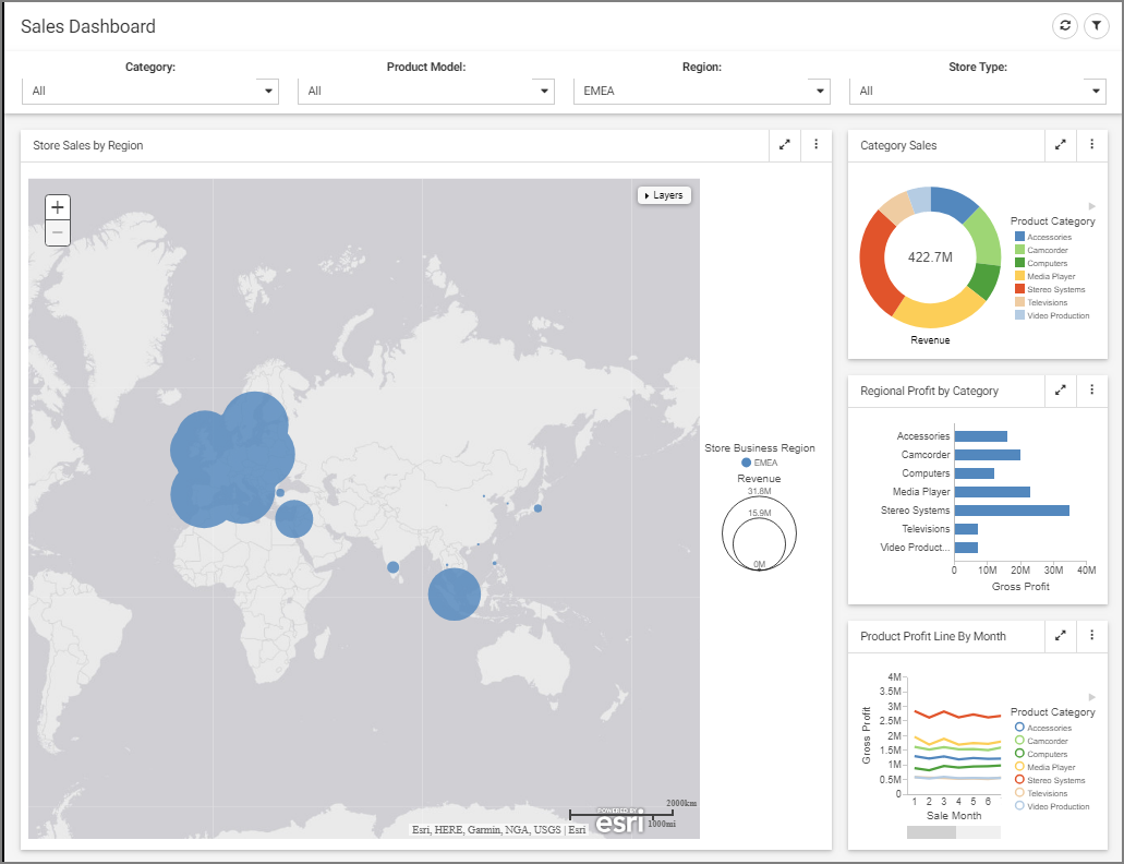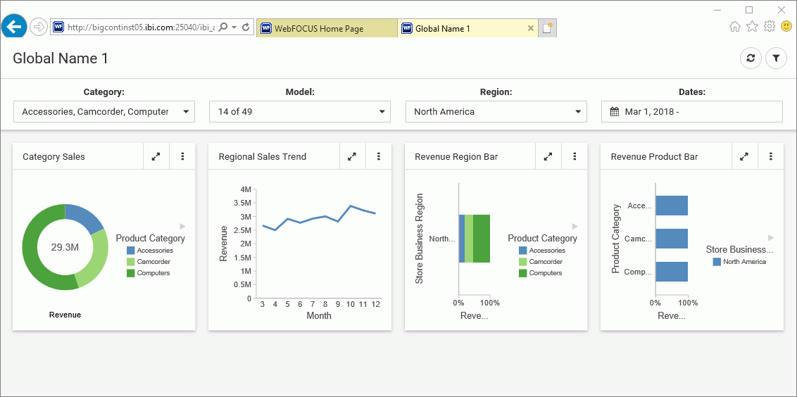 As you create charts and styled tabular content in WebFOCUS Designer, you may want to narrow the display of information that is shown. You can do this by creating filters for fields in your data source. You can also use filters as a way to create custom displays of the data that you show in your content. For example, you may only want to show revenue information for specific product categories and models in a given year, or for product categories that exceed a certain revenue value.