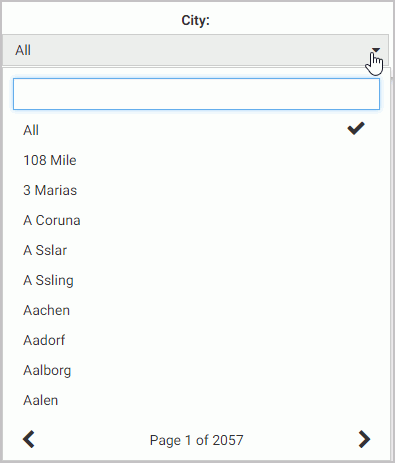 By default, no values are initially selected in the list control, which means that all values are displayed by default. To select default values, you click the filter control, and begin clicking the data values that you want to use as the default, then click outside the filter control area to apply the selection.