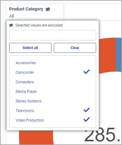 If a filter is configured to exclude selected values, the not equal icon is added to its label to indicate that all your selections will be excluded.