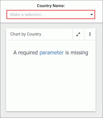 In addition to the options specific to each type of filter, you can make the filter required. When a filter is required, filtered content will not load until the user makes a selection for that filter. To make a prompted filter for new content required, right-click the filter and click Require selection. To make a prompted filter for existing content required, select the filter control and, on the Settings tab of the Properties panel, clear the Optional check box. When this content item runs, the autoprompt window displays, prompting you to choose a value from the drop-down list, as shown in the following image. You can also use the Search field to locate a value.