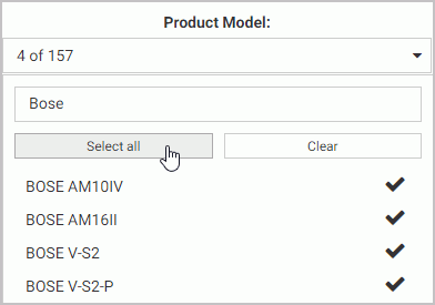 If you select one or two values, each selected value is listed by name in the filter control. If you select three or more values, the filter control shows the number of values selected out of the total number of available values. If no values are selected, the filter control says All. All available filter values are reflected in your content. If you select all listed values or click Select all, then the filter indicates that n of n values are selected. If the values in the field change in the data source, then the filter does not dynamically update to include them like it would if no values had been explicitly selected.