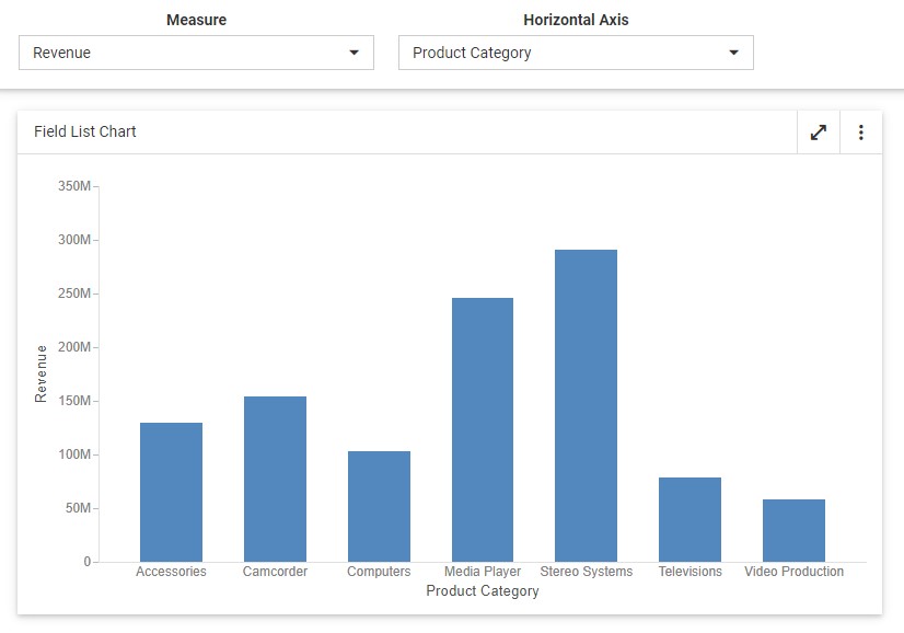 When you run a chart or report with field list parameters, you can select the fields with which each one should be populated using standard filter controls for alphanumeric values. If the chart or report is run stand-alone, these controls are presented in the autoprompt interface. If the chart or report is added to an assembled page, you can create filter controls for each field list parameter to allow users to select fields for each one. The following image shows a page with controls for multiple field list parameters.