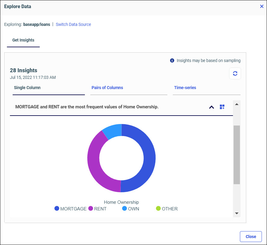 The total number of insights generated, with a time stamp, is displayed. If your data is dynamic, you can click the refresh icon to gain updated insights.