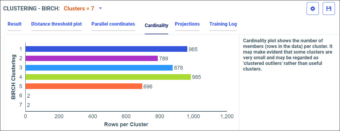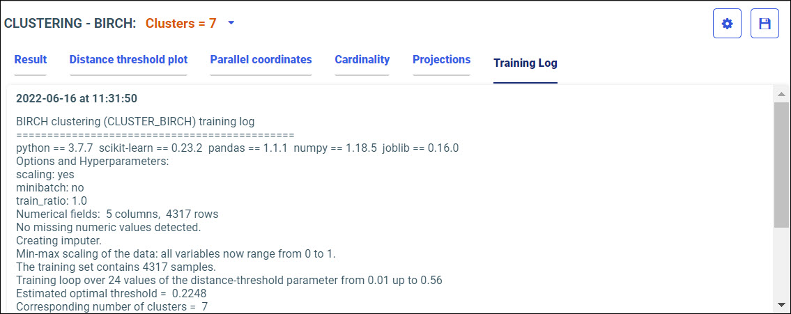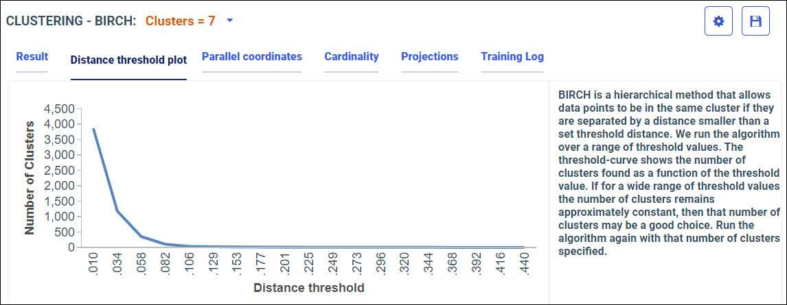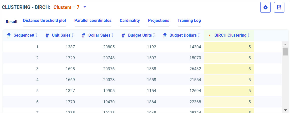 Your model data displays in the following tabs, using the BIRCH algorithm.