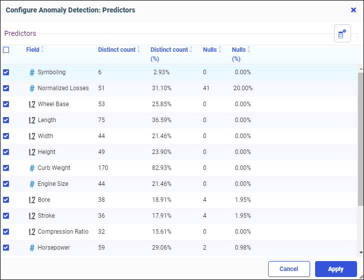 All numeric Field measures are selected by default as Predictors. You can add or remove Predictors by selecting or unselecting the check boxes.