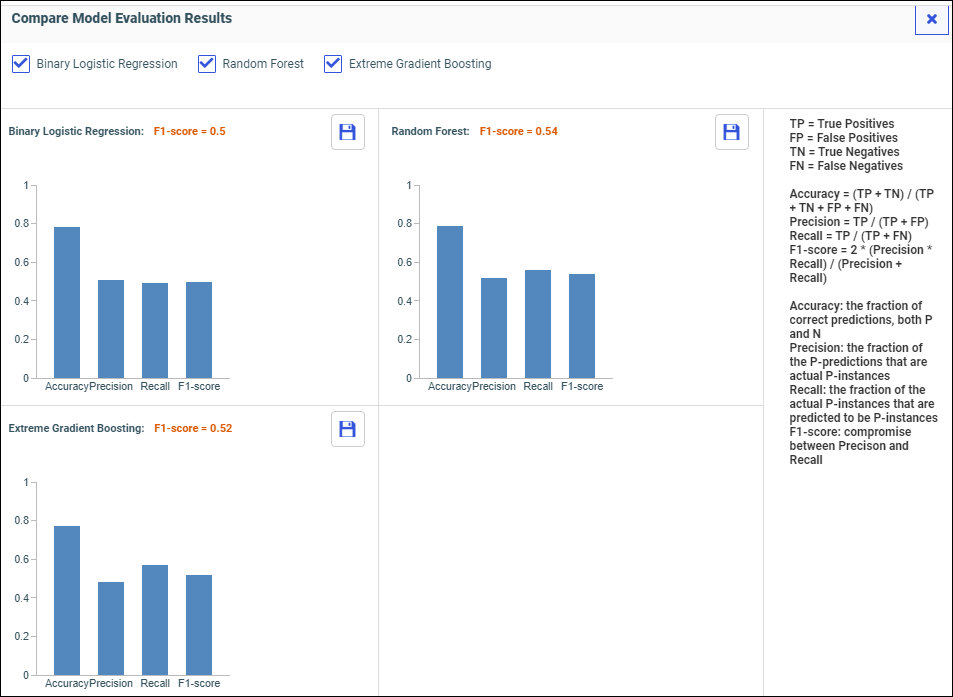 The model algorithms run in parallel, allowing you to easily compare results and determine which model is best. You can filter which model comparisons you want to see by selecting or deselecting the model check boxes.