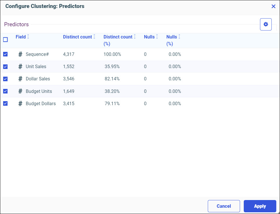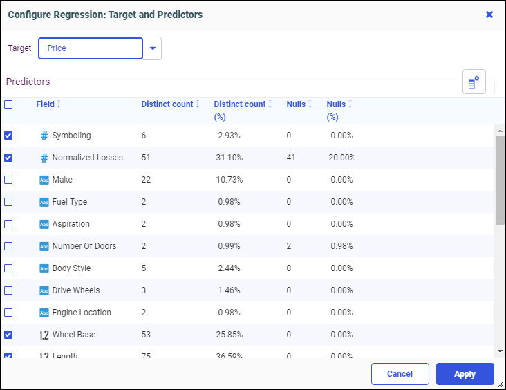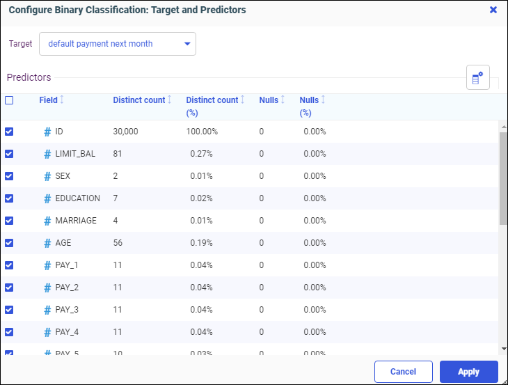 You can click the Target dropdown menu to select a different target. All numeric Field measures are selected by default as Predictors. You can add or remove Predictors by selecting or unselecting the check boxes.