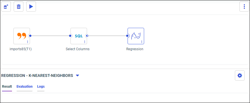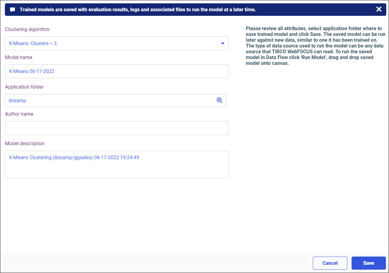 When training a model, you can save it from the Compare Model Evaluation Results dialog box. After running a model, you can save it from the tabbed panel beneath the canvas. You can then re-run your saved model against new data sets.