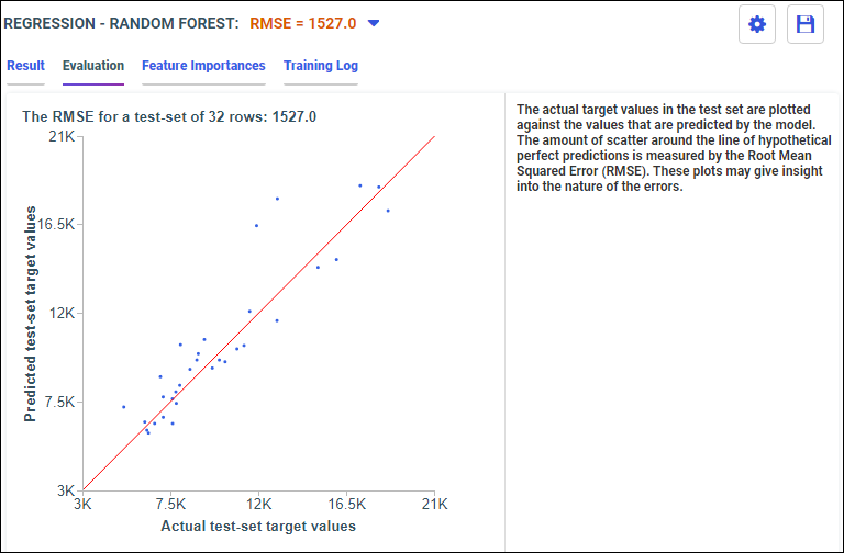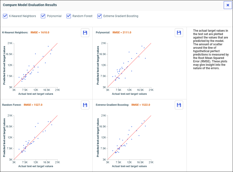 The model algorithms run in parallel, allowing you to easily compare results and determine which model is best. The best model has the lowest Root Mean Square Error value, and a scatter plot with dots closest to the red line You can filter which model comparisons you want to see by selecting or deselecting the model check boxes.