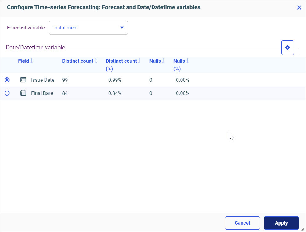 You can click the Forecast dropdown menu to select a different Forecast variable. You can choose a Date/Datetime variable by selecting its radio button.