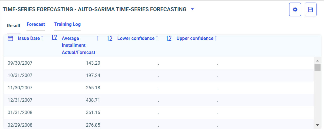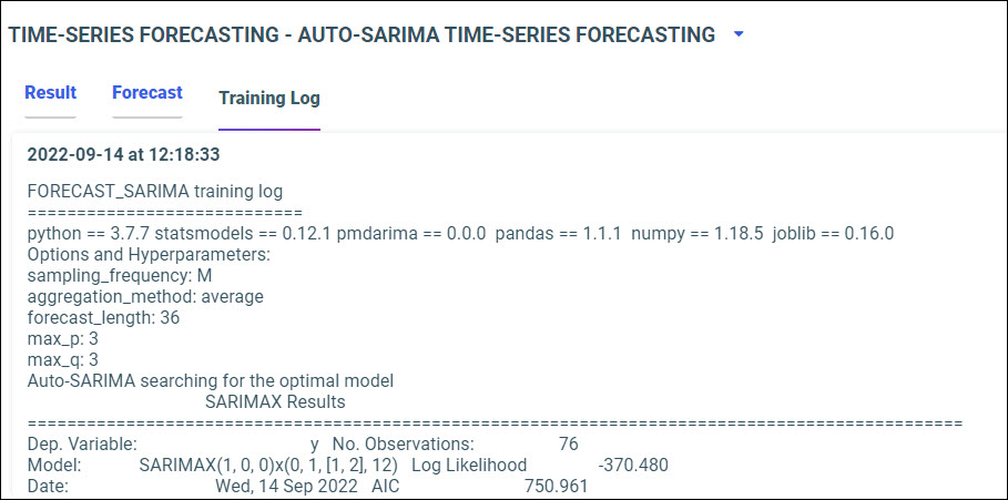 Note: For Time-Series forecasting models, if the chosen parameter for Sampling frequency is too long, it may result in too few data points to produce reliable statistics. In this case, the algorithm will modify the sampling to a shorter frequency, for example, from Year to Quarter, and redo the analysis. Sampling frequency modifications are reported in the training log.