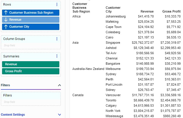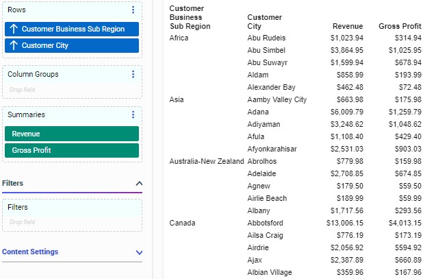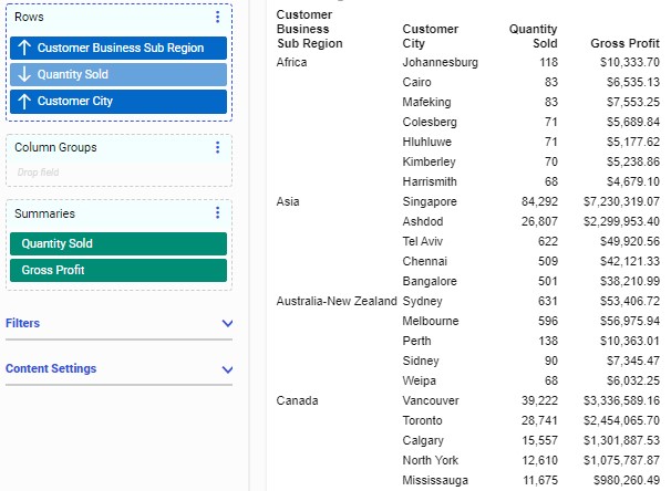 Sorting is hierarchical, so values are first sorted by the first field in the Row or Column bucket, then by the second field, and so on. For example, in the following image, the report is sorted by the Product Category field, then for product subcategories under each product category, then by sale year values for each product subcategory. Product Category, Product Subcategory, and Sale Year have all been placed into the Rows bucket. Gross Profit was placed in the Summaries bucket, so it is not used to sort the report. Instead, gross profit values are sorted by the other three fields.