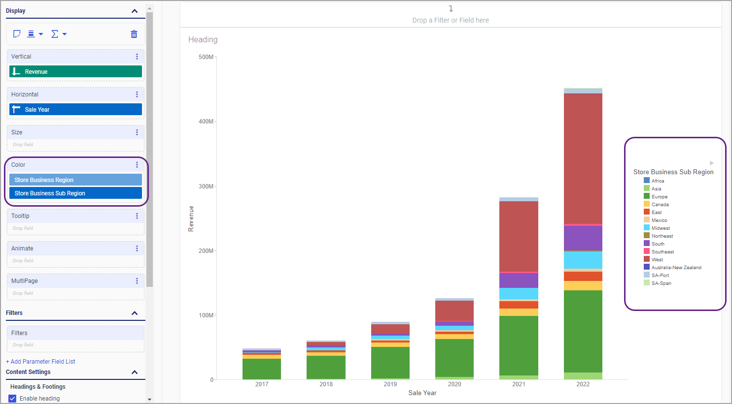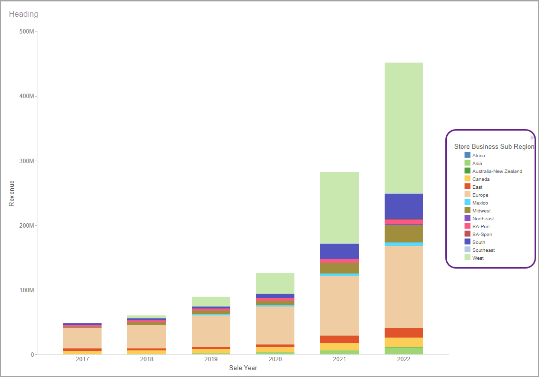 With many chart types, you can use legends to quickly visualize segments of your data by color. In the following image, we have an example of the Year by Revenue stacked bar chart, with the legend showing you subregions.