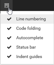 Clicking the Options button displays a submenu of preferences, which enable you to manage your code. Options include line numbering, code folding, autocomplete, status bar, and indent guides, as shown in the following image. You can selectively turn these features off or on in a file.