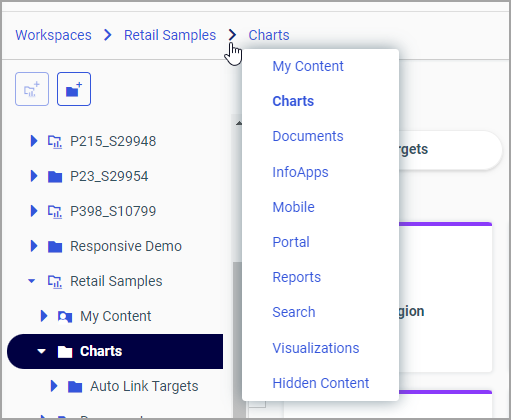 You can expand or collapse workspaces and folders by clicking the arrows next to them. When you click a folder, its contents display in the content section. You can also right-click a folder to access a shortcut menu of available options. From the shortcut menu, you can perform the following actions:
