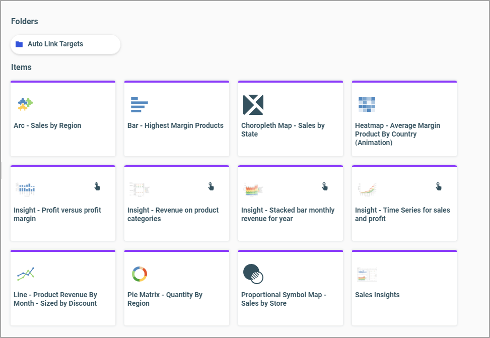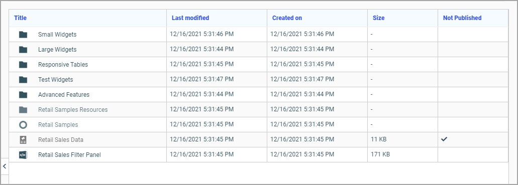 If a resource contains folders and items, the folders are always displayed first, followed by the items. Items shown in the content section include reports, charts, pages, portals, and more.