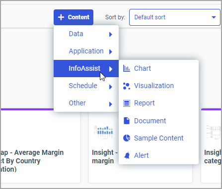The +Content menu only displays the items that you can create for the workspace or folder that is currently selected. The items displayed in the +Content menu are also subject to permissions. You can only see the items that are available to you based on your role. To learn more about roles, see the WebFOCUS Security and Administration technical content.