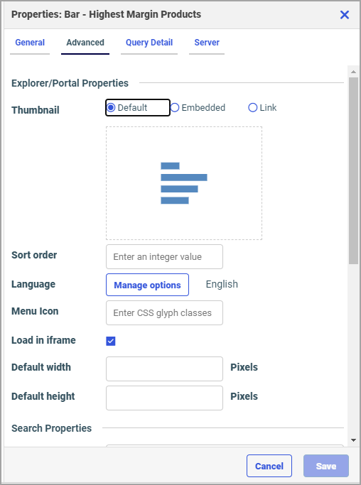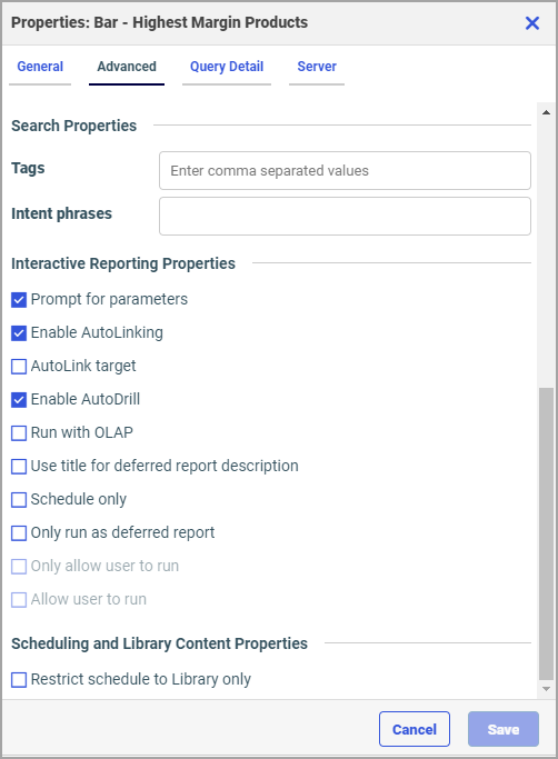 Authorized users can select the Properties option to review information about a folder or item, including when it was created, the date it was last modified, title, name, and settings that control the WebFOCUS Reporting Server and applications it will access. There are also settings that control the functionality available to users when they access the folder, run, or schedule an item.